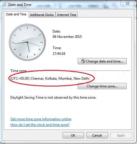 डयन दे की आपका कंप्यूटर का तारीख और समय भारतीय स्थानों के अनुसार निर्धारित होना चाहिए। जो की (UTC+05:30) है।
